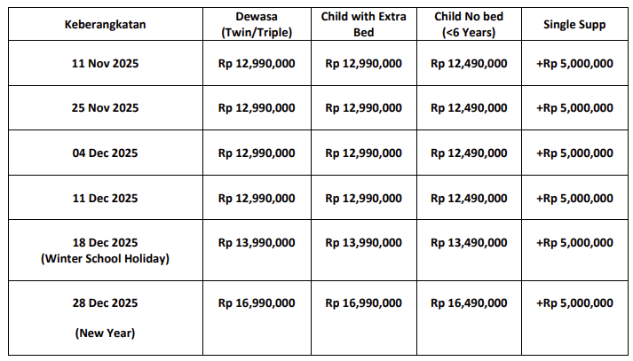 Keberangkatan Minimal 20 Pax (Didampingi 1 Tour Leader) Pendaftaran Deposit Rp. 6.000.000 (First