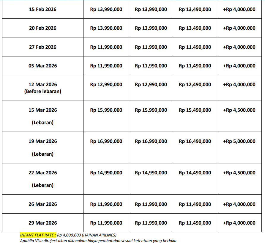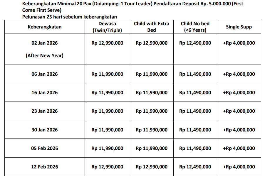 7. Harga tour kami merupakan harga All in (Termasuk tax international), dengan tariff dasar
