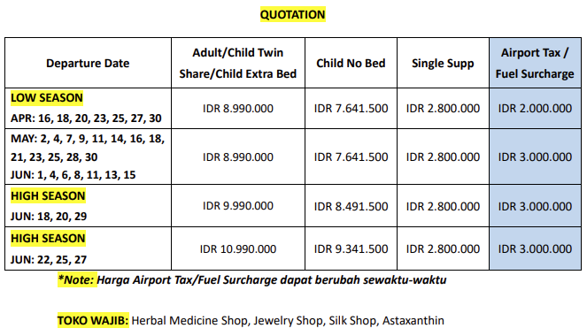 | Airport Tax / Fuel Surcharge orang | Rp 3.000.000 | Rp 3.000.000 |