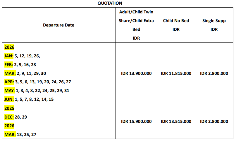 • Semua tarif di atas hanya berlaku untuk 24 orang + 1 Tour Leader (TL)