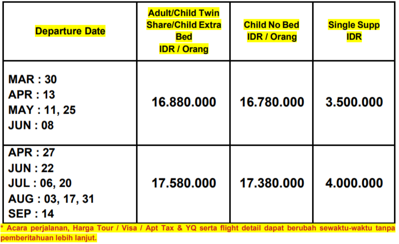 ● Harga berdasarkan 24 Peserta Dewasa + 1 Tour Leader.
