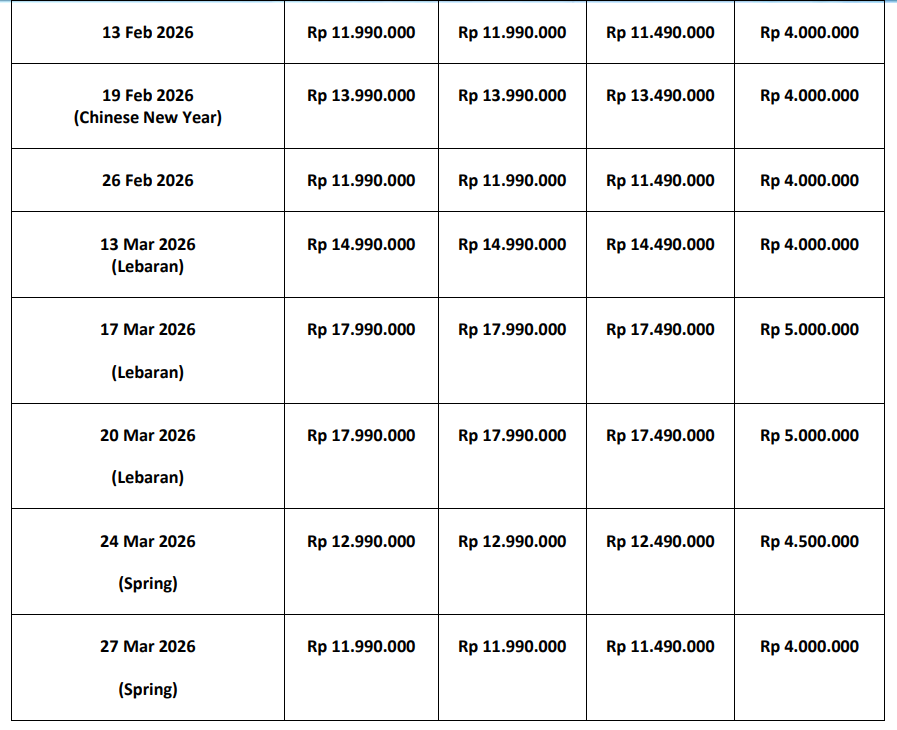 | Twin orang | Rp 11.990.000 | Rp 11.990.000 |