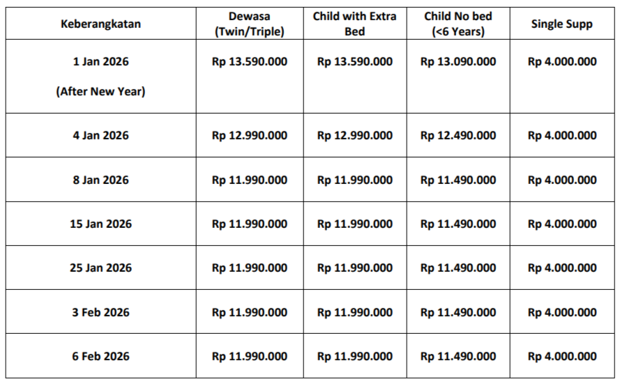 | Twin orang | Rp 11.990.000 | Rp 11.990.000 |