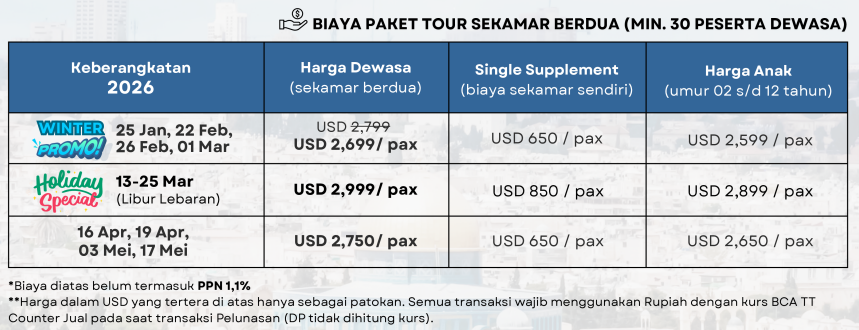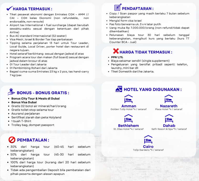 Berkumpul di Bandara Soekarno Hatta, di TERMINAL 3BC, 4 jam sebelum keberangkatan, kita akan bersiap untuk terbang menuju Dubai sebelum berlanjut ke Amman, Jordan.