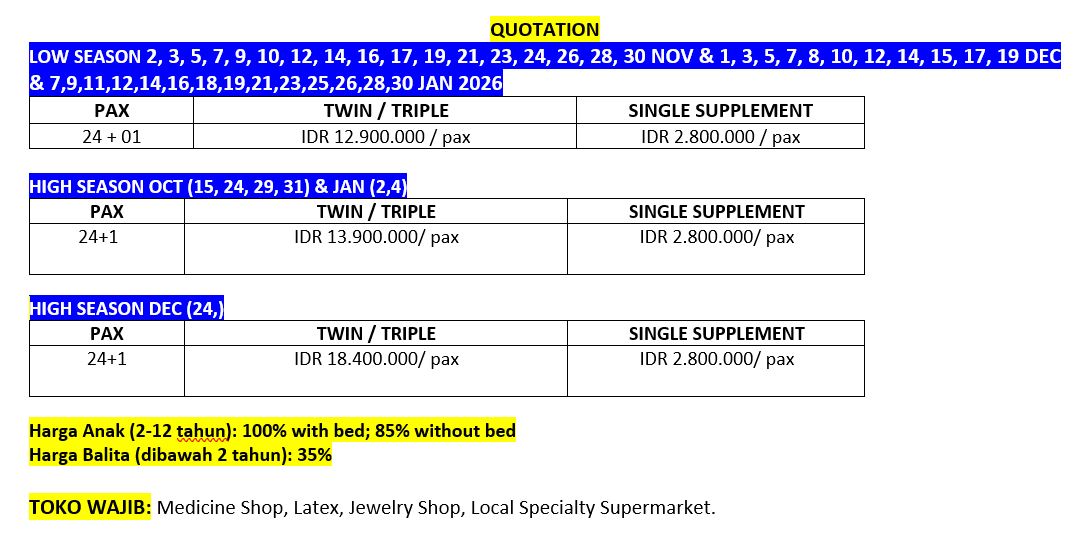 Keberangkatan minimum 24 Peserta Dewasa // Harga dalam IDR x 1.000