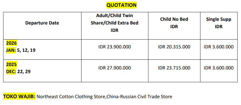 ● Semua tarif di atas hanya berlaku untuk 24 orang + 1 Tour Leader (TL)