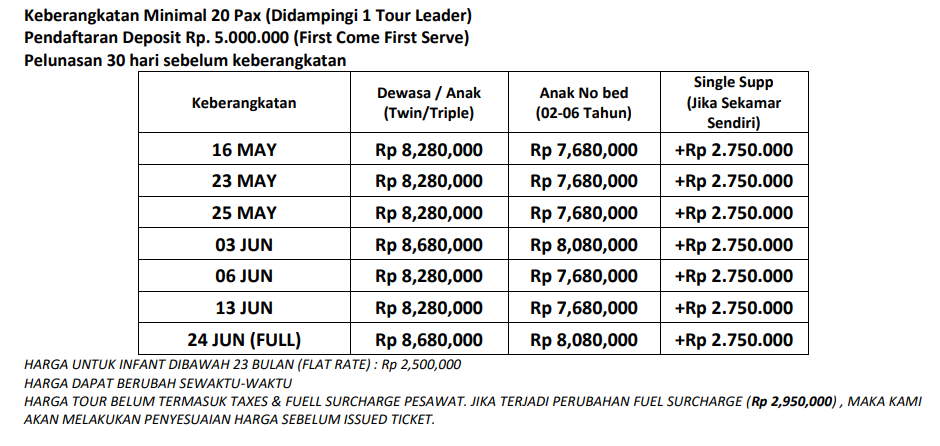 3. Harga tour sudah termasuk Airport Tax International & Fuel Surcharge dan dapat berubah sewaktu-waktu dan