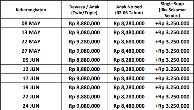 Untuk keberangkatan 19 – 24 peserta akan ada biaya tambahan sebesar IDR 600.000 (Peserta yang mendaftar