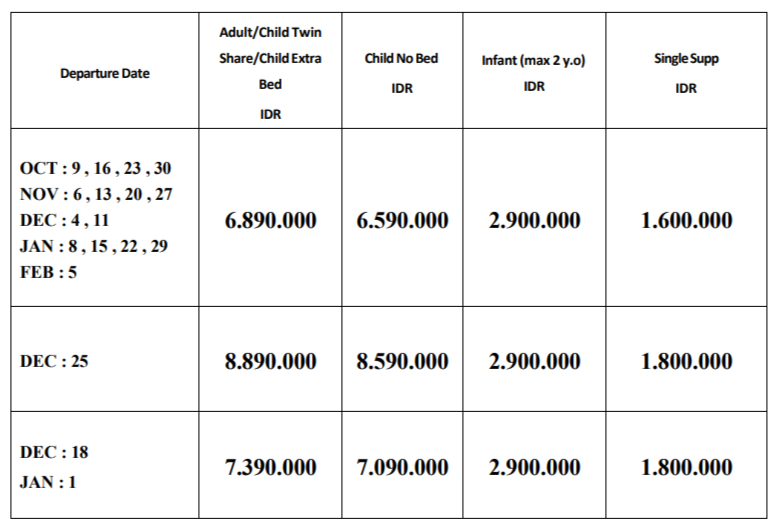 Harga berdasarkan 20 Peserta Dewasa + 1 Tour Leader.