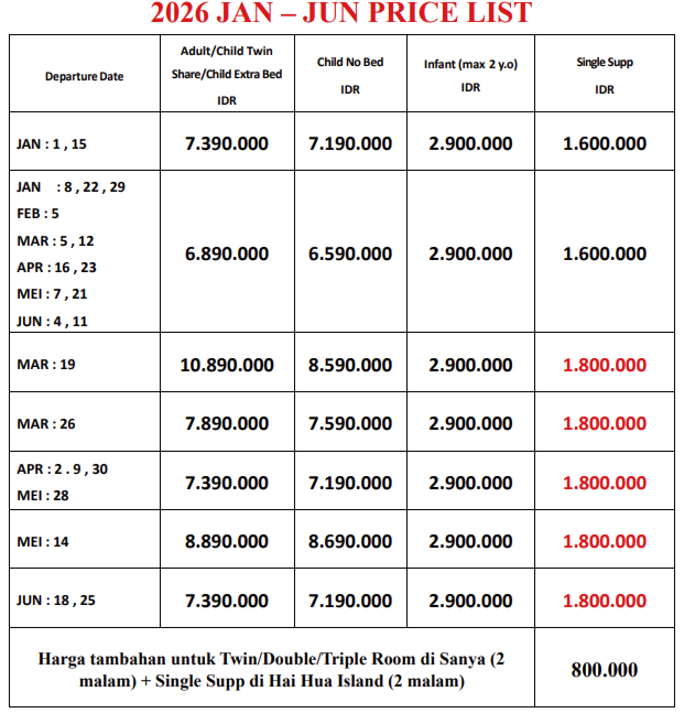 Harga berdasarkan 20 Peserta Dewasa + 1 Tour Leader.