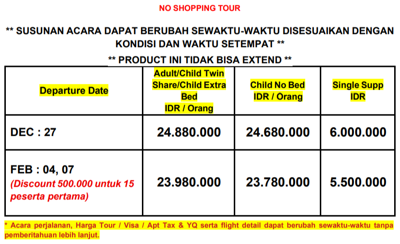 akan dirubah dan bersifat non-refundable (tidak dapat dikembalikan). Dan Biaya Tour tidak termasuk
