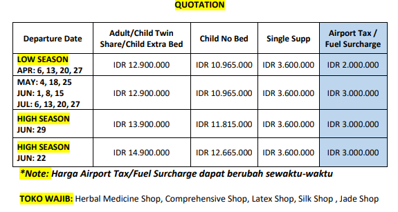 • Semua tarif di atas berlaku untuk minimal 24 orang + 1 Tour Leader (TL)