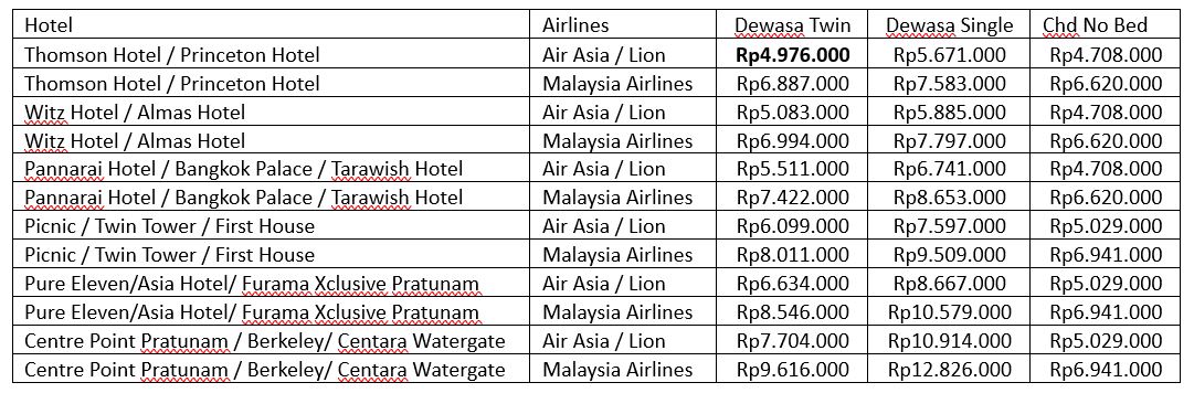 | Twin (Thomson Hotel / Princeton Hotel) orang | Rp 4.976.000 | Rp 4.976.000 |