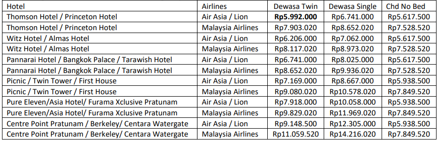 | Twin (Thomson Hotel / Princeton Hotel) orang | Rp 5.992.000 | Rp 5.992.000 |