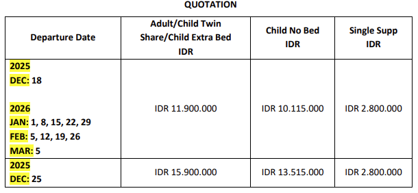 ● Semua tarif di atas hanya berlaku untuk 24 orang + 1 Tour Leader (TL)