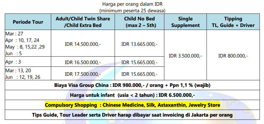 o Harga berdasarkan minimum keberangkatan 25 peserta dewasa, Group akan diberangkatkan apabila