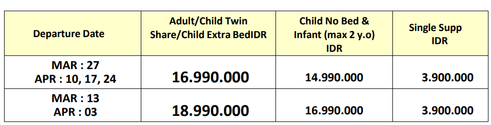• Harga berdasarkan 25 Peserta Dewasa + 1 Tour Leader.