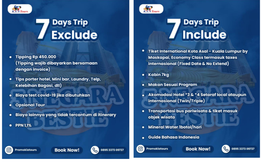 Setelah sarapan pagi rombongan check out, di mulai dengan mengunjungi Genting Highland menaiki cable car/Gondala, kemudian mengunjungi Bt Caves Dan Makan siang, setelah itu berbelanja di Lokal Produk, Kemudian Melanjutkan perjalanan menuju Kualalumpur Twin Tower (Photo Stop) Dan Mengunjungi Pabrik Coklat,Setelah itu rombongan akan berangkat ke Johor Makan Malam Dan check in di Hotel. Acara bebas sekitar hotel. Bermalam di Hotel Setaraf ***