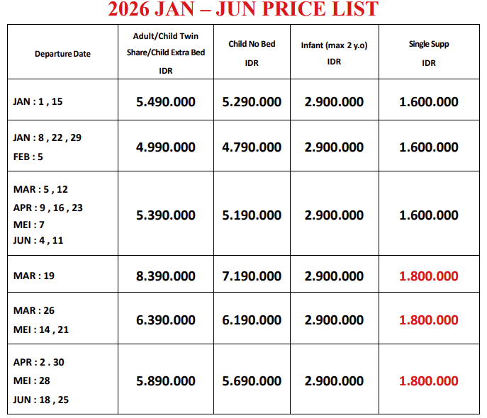 Harga berdasarkan 20 Peserta Dewasa + 1 Tour Leader.