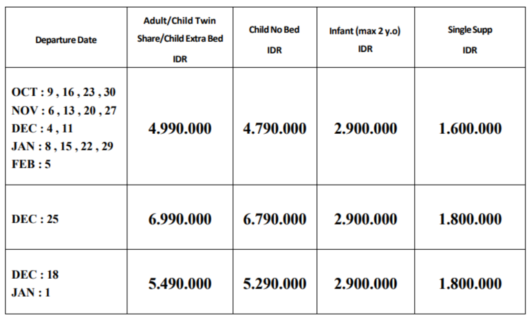 Harga berdasarkan 20 Peserta Dewasa + 1 Tour Leader.
