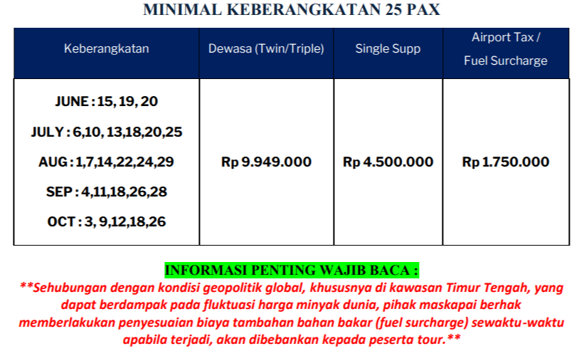 | Airport Tax / Fuel Surcharge orang | Rp 1.750.000 | Rp 1.750.000 |