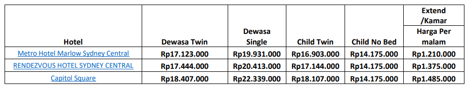 Harga belum termasuk ; Visa Aussie (IDR 2,8 Juta), PPN 1.1%, Asuransi perjalanan.