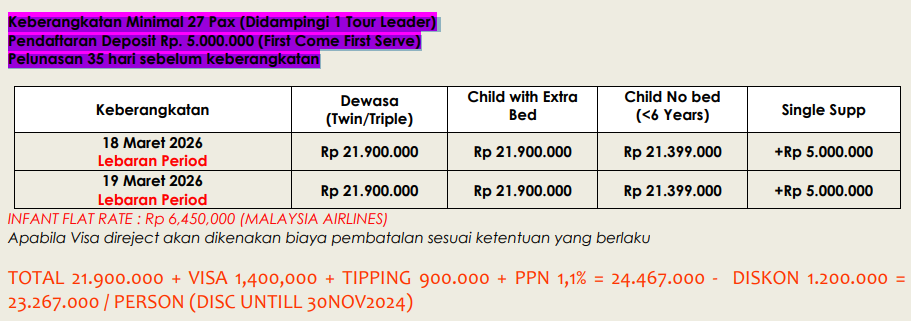 *Peserta tour wajib sudah divaksin 3 kali (sudah di vaksin booster ketiga tanpa batas waktu) dengan vaksin yang sudah