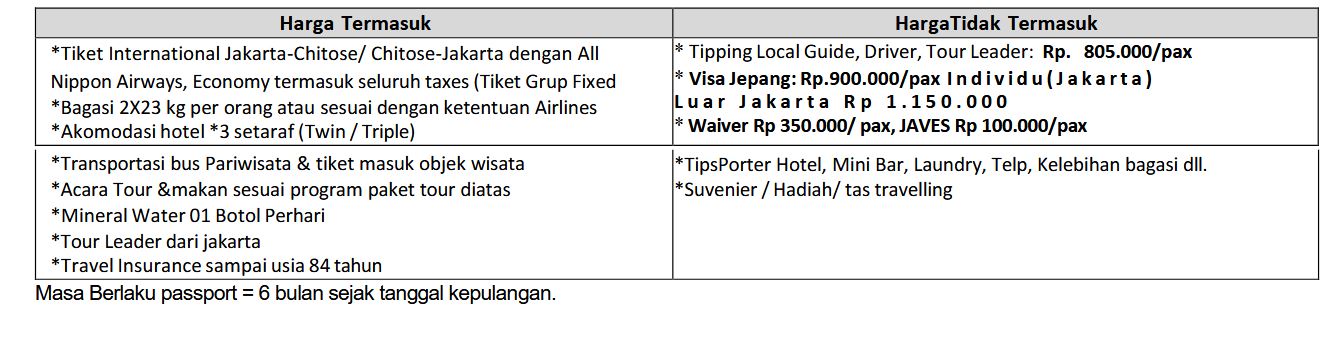 Acara hari ini Anda berkesempatan untuk mengunjungi Mt.Zao dengan ropeway sambil menikmati pemandangan yang indah. Dilanjutkan menuju Tokyo dengan kereta cepat . Tibanya di Tokyo, anda menuju airport untuk perjalanan kembali ke Jakarta. Hari 07: TOKYO – JAKARTA NH871 HNDCGK 0005 0600 Perjalanan menuju Jakarta, kita bersiap-siap untuk Kembali ke tanah air. Sampai jumpa di perjalanan menyenangkan bersama kami selanjutnya.