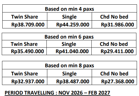 • Tipping selama perjalanan untuk Local Driver. (USD 35/pax)