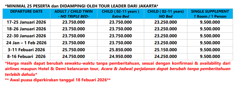 *)Untuk Jadwal Visa Regular apabila penuh maka dikenakan biaya prime time +Rp. 1.000.000/pax. Apabila Prime time penuh maka apply