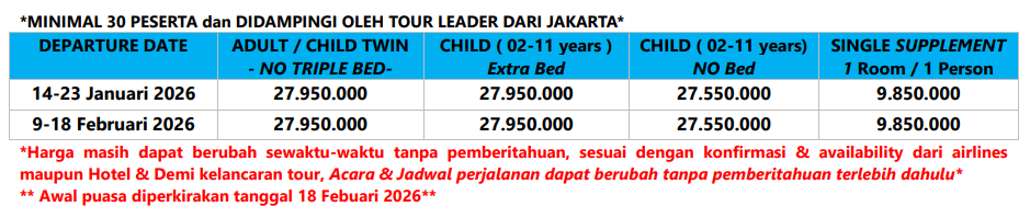 *)Untuk Jadwal Visa Regular apabila penuh maka dikenakan biaya prime time +Rp. 1.000.000/pax. Apabila Prime time penuh maka apply