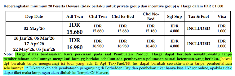 Pengeluaran pribadi, Visa(Harga visa China tourist regular dapat berubah sewaktu-waktu) , Asuransi Perjalanan, Tipping (Rp.